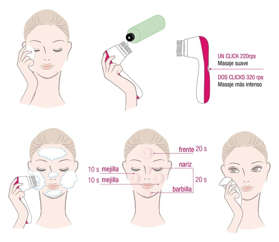 📦 Incluye: Dispositivo + 5 cabezales (limpieza, masaje, exfoliación) + manual.